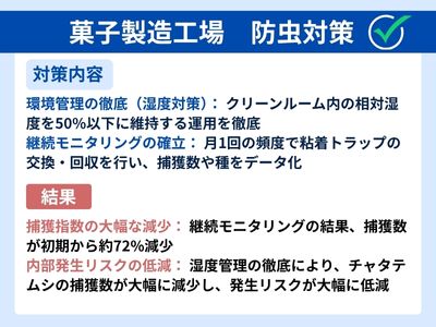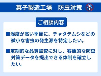 この度は、クリーンルームに最適な根本的な微小害虫対策をご提案でき、大変光栄です。 HACCP対応の課題であったチャタテムシのリスクを、初期モニタリングで特定し、『湿度50%以下』という環境管理のサポートをさせていただきました。 今後も、このリスク管理体制を維持し、企業様の安心・安全な製造をサポートしてまいります。