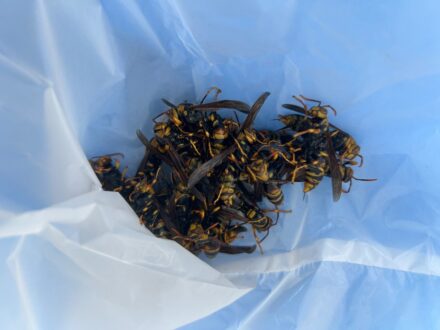 10月くらいになると、アシナガバチの盛んなシーズンも終わり、営巣していた巣を旅立ち、女王バチが途中で休憩ポイントに留まると、他の働きバチも一緒に集まって「分封」状態になります。1日でその場から立ち去ることもあれば、1週間ほどその場に留まることもあります。刺激を与えなければ、大人しい状態ですが、故意に刺激を与えなくても振動を過敏に感じ取り、飛び回ることもありますので、ハチの数が多い際には注意が必要です。