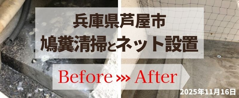 兵庫県芦屋市・マンションの鳩(ハト)フン清掃・防鳥ネット設置の施工事例